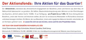 Der Aktionsfonds ermöglicht die kurzfristige finanzielle Unterstützung von hauptsächlich ehrenamtlichen Projekten im Quartiersmanagementgebiet. Dabei müssen die Projekte die folgenden Kriterien erfüllen: