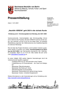 Wer sich über das Projekt informieren und mit anderen Vereinen austauschen möchte, ist herzlich zum zweiten Vernetzungsabend am Dienstag, den 28.01.2020 in der Villa Neukölln (Herrmannstr. 233, 12049 Berlin) eingeladen. Beginn ist um 18:15 Uhr. Bitte melden Sie sich vorher unter vereint@nbh-neukoelln.devereint@nbh-neukoelln.de an.
