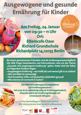 Am Freitag, den 24.01.2020 findet von 9:30 - 11:00 Uhr eine Informations- und Beratungsveranstaltung mit der Ernährungswissenschaftlerin und -beraterin Uta Hille zum Thema »Ausgewogene und gesunde Ernährung für Kinder« im Elterncafe Oase in der Richard-Grundschule statt. Alle Interessierten sind herzlich willkommen. Eine Anmeldung ist nicht erforderlich.