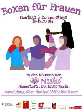 Jeden Montag und jeden Donnerstag findet in den Räumen von Nasiha e.V. in der Niemetzstraße 20 zwischen 18:00 - 19:30 Uhr Boxtraining für Frauen statt. Anmeldung und mehr Informationen: naciye187@hotmail.com