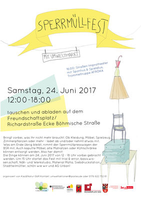 Auch kaputte Möbel, alte Matratzen oder Kühlschränke können entsorgt werden. Um 15 Uhr startet das Umweltfest mit Trial & Error, basis.wissen.schaft Werkstudio, Siebdruckstation, Stadtteilmütter, Material Mafia, schön wie wir und AG Urban.