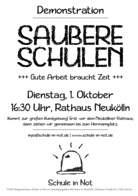 Unter dem Motto "Saubere Schulen - Gute Arbeit braucht Zeit" wird ab 16:30 Uhr zunächst eine Kundgebung vor dem Rathaus Neukölln stattfinden. Anschließend soll zum Hermannplatz gelaufen werden, um weitere Aufmerksamkeit zu erregen.