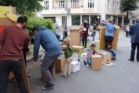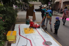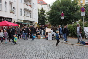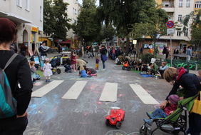 Die beiden Projektträger waren angetreten, um auf jeden Parkplatz eine eigene Welt zu kreieren, in der Kunst, Spiel und Spaß auf 60 Parkplätzen à 10 qm einen Ort finden. Blickt man auf die Kinder, so ist es ein Festtag geworden, denn sie können an der Parzelle des Quartiersmanagements Bowling spielen und gleich nebenan ein aus Kartons konstruiertes Haus bemalen, oder eben gleich die Straße selbst mit Kreide nach ihren Wünschen schmücken. Die Straße ist längst ein Ort des Verweilens. Der Böhmische Platz wird so zum Kiezplatz mit erheblicher Aufenthaltsqualität. Musik und Tanz lassen die mögliche Lebendigkeit des Terrains erahnen, was möglich wäre, wenn weniger Autoverkehr den Platz prägen würde. Auch die Bezirksbürgermeisterin Dr. Franziska Gifffey findet anerkennende Worte und der Bezirksstadtrat Jochen Biedermann drückt seine Begeisterung aus. „Geduld“ und „Interessenausgleich“ sind die Vokabeln, die dann natürlich nicht fehlen dürfen, aber eine menschenfreund-lichere Umgestaltung des Platzes scheint nicht unmöglich.