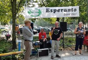 Dann lief ein buntes Programm ab, moderiert von Sofie Koscholke von Yopic e.V. und Fritz Wollenberg von der ELBB und eröffnet durch den Esperanto-Reggae-Sänger Jonny M, der zum dritten Mal auf dem Esperantoplatz auftrat und es wieder verstand, das Publikum im Alter von 5 bis 90 zu begeistern. Veganaj homoj man?as ne la bestojn – Vegane Menschen essen keine Tiere - war seine erste musikalische Botschaft an diesem Tag, ein Plädoyer für die Achtung des Tierwohls, die Einschränkung des Fleischkonsums und damit die Vermeidung der negativen Auswirkungen auf die Umwelt. Im Internet kann man einen Videoclip sehen und sein Lied nochmal hören: https://www.youtube.com/watch?v=9dKjiT2D5C0Ein.
