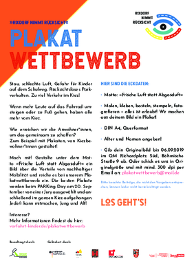 Unter dem Motto “Frische Luft, statt Abgasduft” veranstalten wir einen Plakatwettbewerb, bei dem Rixdorfer Kinder und Erwachsene eingeladen sind, die Vorteile nachhaltiger Mobilität bildlich darzustellen. Im Rahmen des PARKing Day am 20. September 2019 werden alle entstandenen Plakate ausgestellt. Eine Jury wählt die besten Plakate aus, die dann im ganzen Kiez aufgehängt werden.