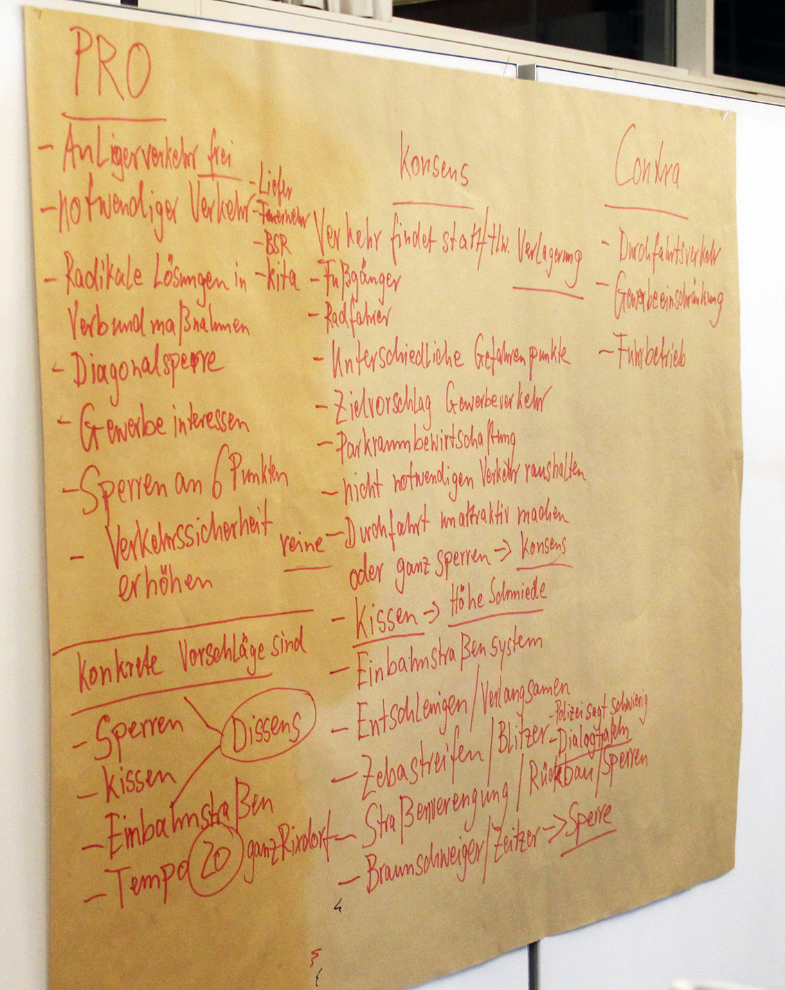 Im Verlauf des Abends wurden viele konstruktive, wie auch kontroverse Vorschläge diskutiert, wie z.B. der Einsatz von Dialogdisplays, "Moabiter Kissen" und zusätzliche Geschwindigkeitsbegrenzungen. Kritisch diskutiert wurde vor allem die Themen Fahrbahnverengung und Diagonalsperrungen.