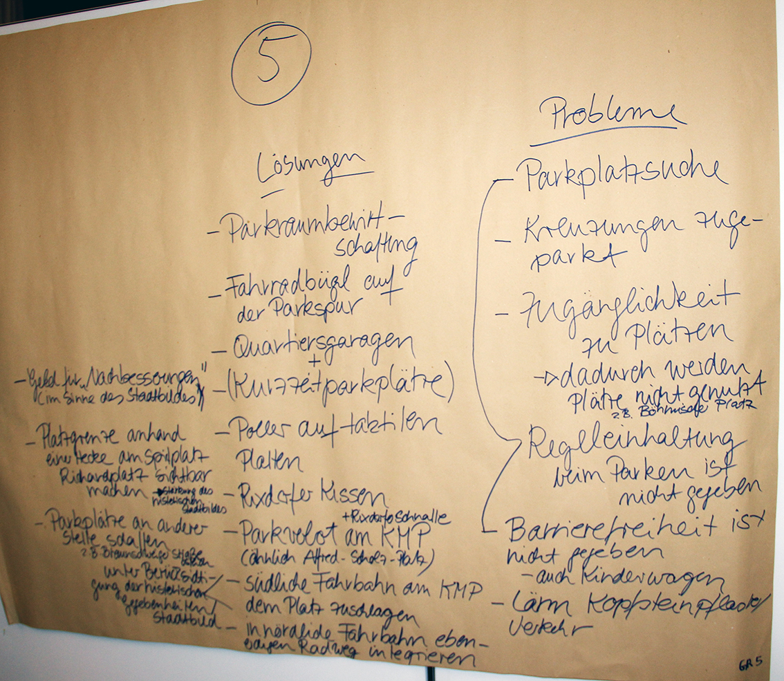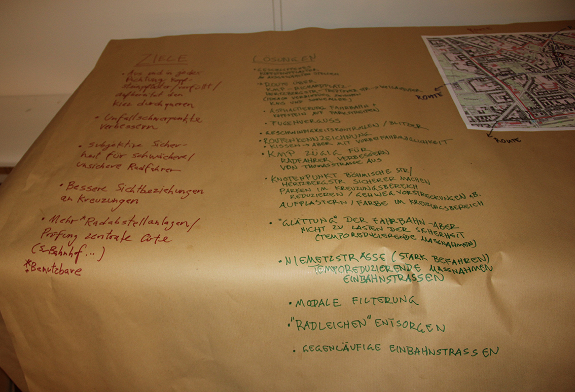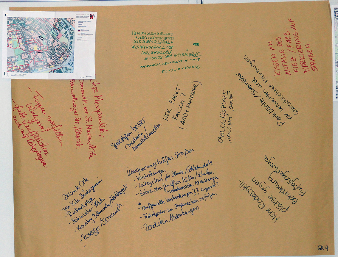 Die Beteiligungswerkstatt am 21.02.18 ist Teil des Konzepts, so wurde von Dezember 2017 bis Februar 2018 zunächst eine klassische Bestandsaufnahme in Form von Interviews mit Anwohner*innen und Gewerbetreibenden im Kiez gemacht. Außerdem wurde die tatsächliche Verkehrssituation planerisch genauer „unter die Lupe“ genommen. Die eingebrachten Impulse der Beteiligungswerkstatt werden nun in die weitere Konzeption einfließen und voraussichtlich im Mai 2018 in einer öffentlichen Veranstaltung erläutert.