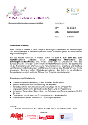 Detaillierte Informationen zur Stelle und über das Projekt entnehmen Sie bitte der Ausschreibung oder wenden sich direkt an die Mitarbeitenden des Projektes unter der Telefonnummer 030 - 2579 6959 oder per E-Mail a.henning[at]mina-berlin[.]de.
