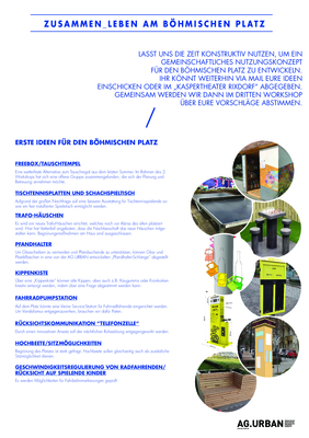 Ideen für den Böhmischen Platz können direkt beim Kasper-Theater am Böhmischen Platz abgegeben, und per Mail bei der AG.URBAN unter mail@ag-urban.de eingereicht werden.