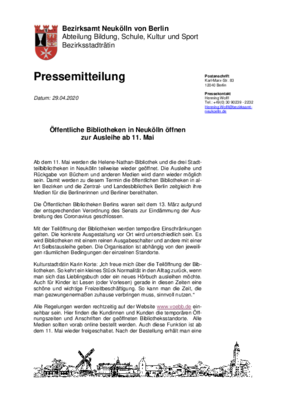 Ab dem 11. Mai werden die Helene-Nathan-Bibliothek und die drei Stadtteilbibliotheken in Neukölln teilweise wieder geöffnet. Die Ausleihe und Rückgabe von Büchern und anderen Medien wird dann wieder möglich sein. Damit werden zu diesem Termin die öffentlichen Bibliotheken in allen Bezirken und die Zentral- und Landesbibliothek Berlin zeitgleich ihre Medien für die Berlinerinnen und Berliner bereithalten.